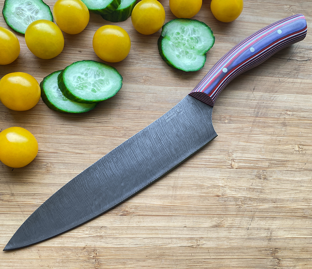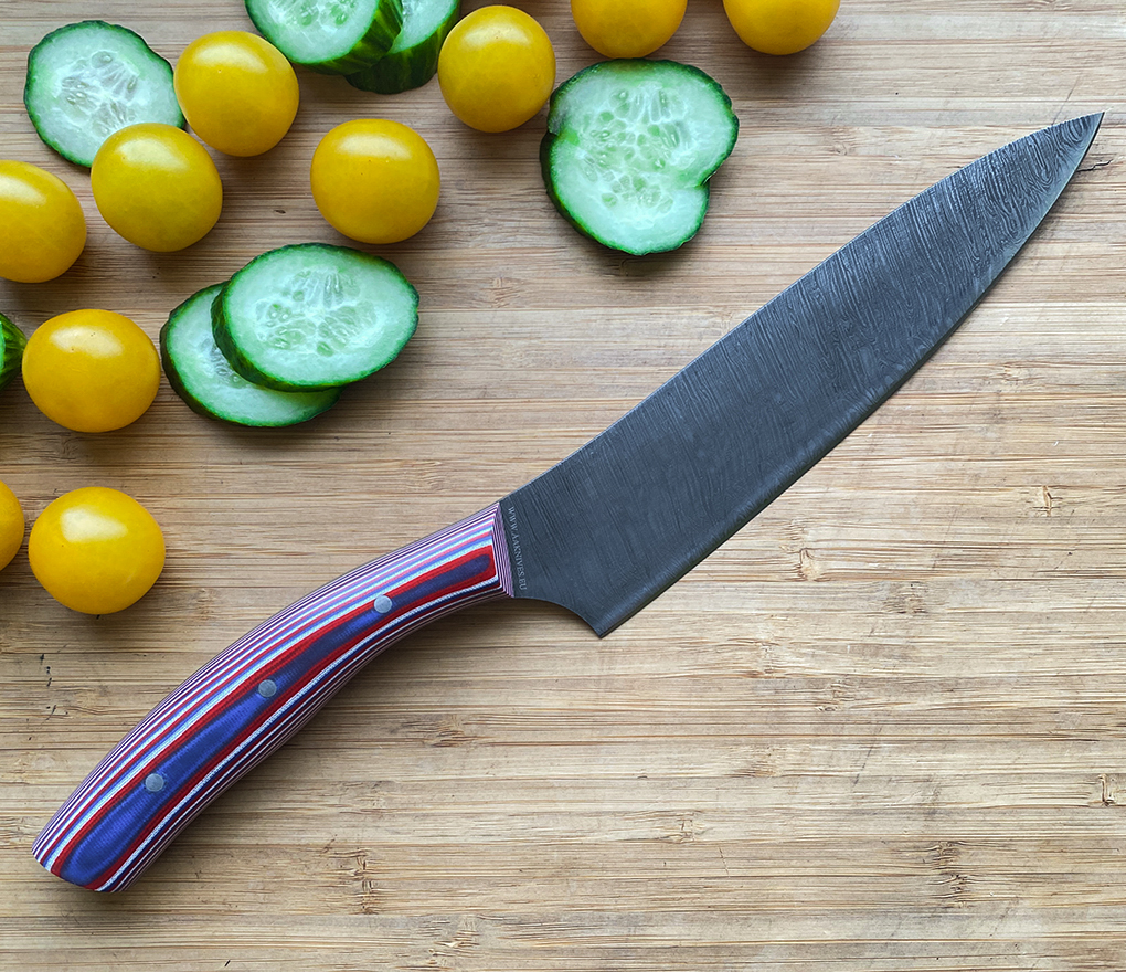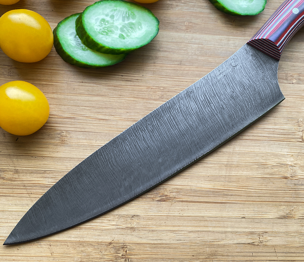 AA Knivesin tarjoama Damascus-teräs taotaan kolmesta eri teräksestä, jotta saadaan aikaan tunnettu ja ainutlaatuinen malli, jossa yhdistyvät kolmen käytetyn teräksen myönteiset työominaisuudet – kestävyys, joustavuus ja pitkäaikainen terävyys. Uskotaan, että erinomaisen leikkauskykynsä ansiosta tämä teräs on usein taipumus päihittää ruostumattomasta teräksestä valmistetut tuotteet, koska sen terä muodostaa mikrosahan kaltaisen pinnan, joka on ominainen useille yhdessä hiotuille teräsmateriaaleille. Koska Damaskusteräs kuuluu ruostuviin teräksiin, on erityisen tärkeää muistaa, että sitä on huollettava asianmukaisesti.