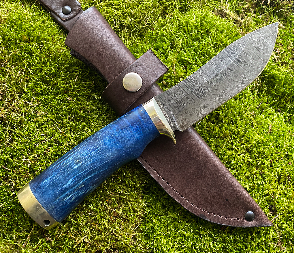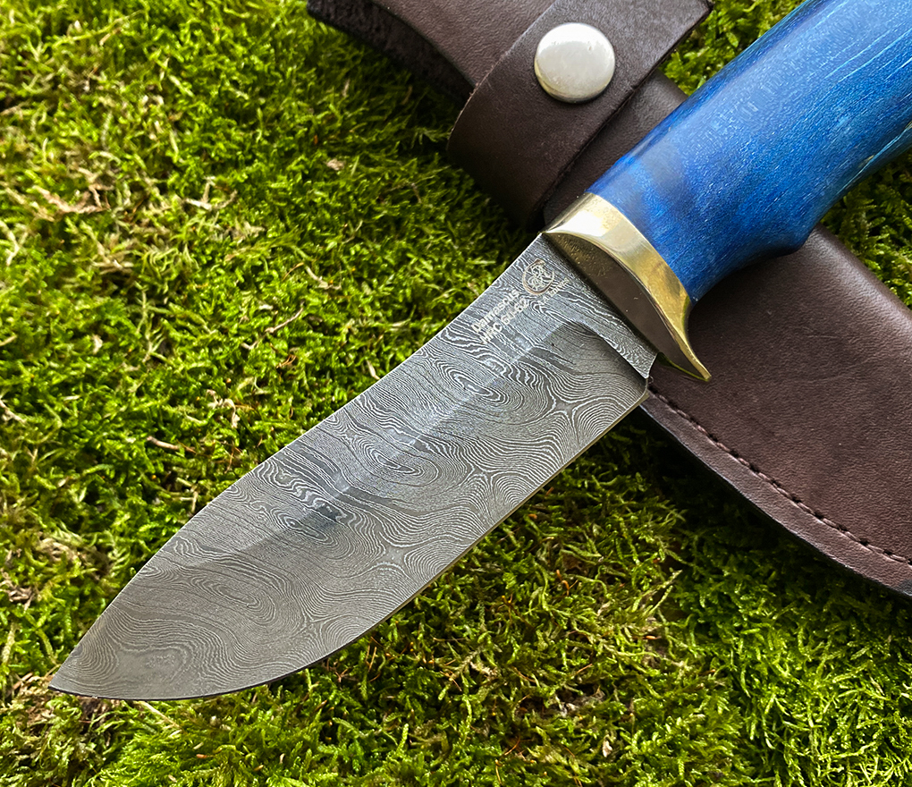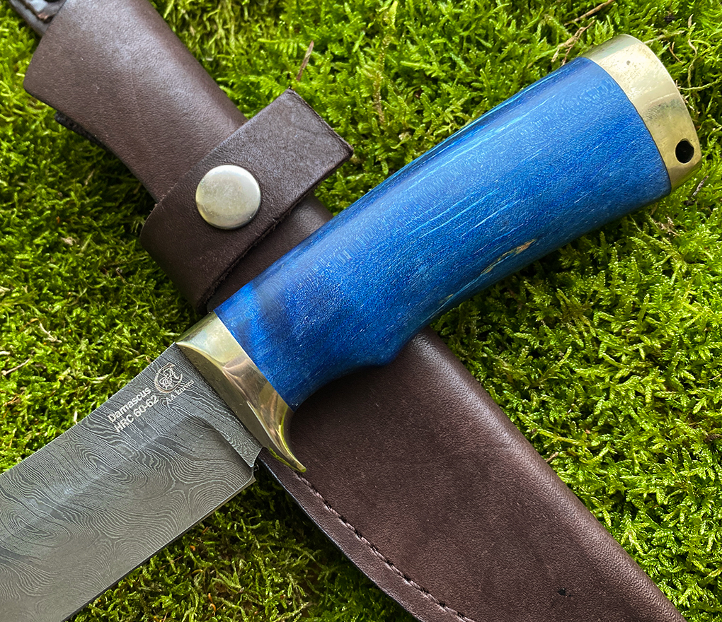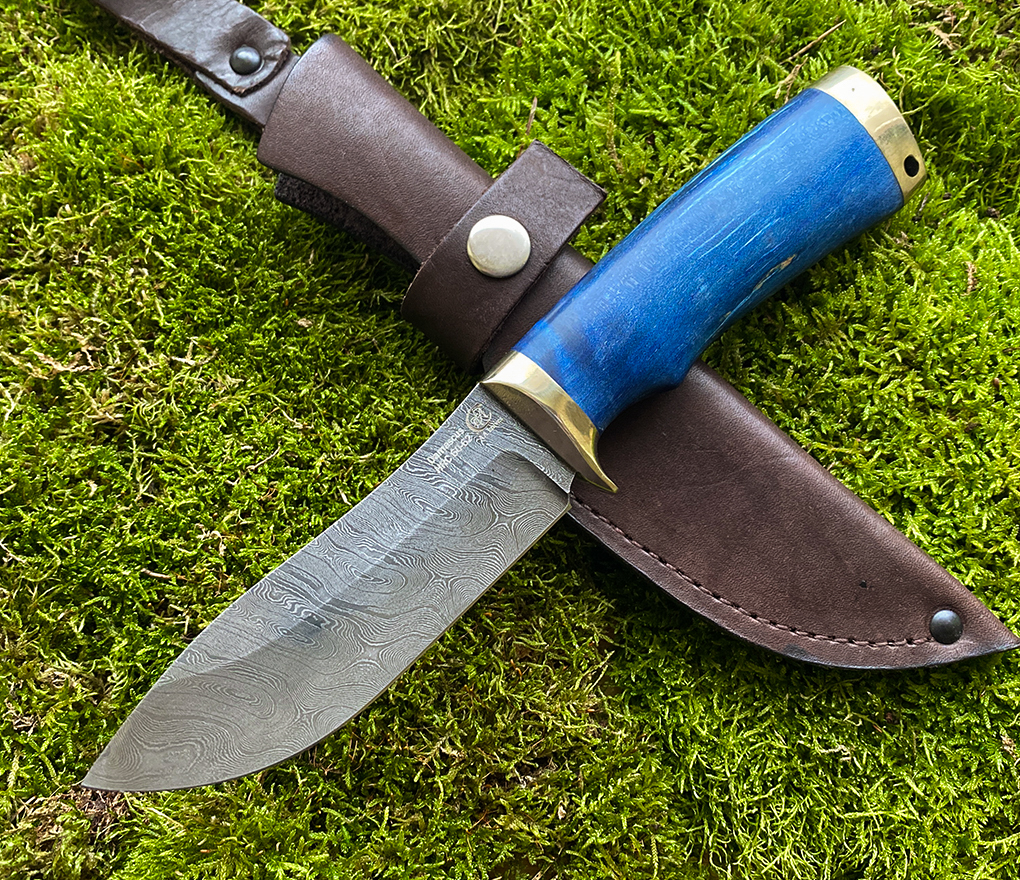 Veitsen tekniset tiedot: ”WILD BOAR” Teräs: Käsin taottu Damascus-teräksestä valmistettu metsästysveitsi, (HVG, U10, ShH15), 800 kerrosta Kovuus: 60-62 HRC Terän pituus (mm): Terän paksuus (mm): 113 / 4,44 tuumaa: Terän leveys (mm): 3 / 0,11 tuumaa: Kokonaispituus (mm): 34 / 1,33 tuumaa Kahva: stabiloitu karjalan koivu: Vahva metsästysveitsi, josta on hyötyä sekä esikäsittelyssä että myöhemmin lihan leikkaamisessa. Sen terä on käsin taottu Damaskusteräksestä, joka tekee siitä erittäin kovan mutta joustavan ja kestävän. Nämä ainutlaatuiset materiaaliominaisuudet saavutetaan muodostamalla pehmeä ja kova metalliseos, jonka tuloksena saadaan paras metsästysveitsi, jossa on tunnettu Damascus-teräspiirustus, joka kestää mikrosahaterän ansiosta pitkään ja pystyy säilyttämään terävyytensä ilman teroitusta hyvin pitkään. Terän huomattava laajeneminen tekee siitä erinomaisen nylkyveitsen, mutta helposti hallittava veitsen kärki ja kavennettu terän kärki estävät sisäelinten loukkaantumisen ilmavuuden aikana tai tarpeettomat viillot myöhemmässä lihankäsittelyssä. Toisaalta käsin taottujen veitsien kahvassa käytetty puu tuntuu synteettisistä materiaaleista poiketen paljon mukavammalta ja mukavammalta kädessä. Metsästäjän itsensä turvallisuuden vuoksi kahvan ja terän välissä on tulppa, joka estää sormien vahingoittumisen puhdistuksen ja riistan käsittelyn aikana, vaikka kädet olisivat liukkaat. Damascus-teräksestä valmistettuun metsästyspuukkosarjaan sisältyy myös kestävä tumma nahkakotelo, jossa on kiinteä niitattu sulkeminen, joka suojaa veistä huonoilta sääolosuhteilta eikä aiheuta vahingossa tapahtuvaa häviämistä. Käsilaukussa on kaksi ripustinta, jotka voidaan kiinnittää vyöhön, jotta ne ovat helposti saatavilla milloin tahansa. Yksi niistä on klassinen kiinteä ja toinen on vapaa ripustin, jonka ansiosta veitsi voi roikkua vapaasti vyön ympärillä ja samalla se mahdollistaa liikkumisen ja välttää epämukavuuden istuessa tai autolla mastosta mastoon siirtyessä, jolloin kiinteä halaus painaa epämukavasti jalkaa tai vyötäröä. Tämä tyylikäs käsin taottu veitsi kestää pitkään ja on uskollinen ja paras metsästysveitsi erinomaisten ominaisuuksiensa ansiosta. Se on kevyt ja mahtuu mukavasti kämmenelle, ja se tarjoaa nopean, turvallisen, tehokkaan ja laadukkaan prosessin. Käsin taottu Damaskusteräs, joka on luotu paketista eri kovuus- ja viskositeettiä olevia teräksiä, jotka taittuvat levyksi tietyssä järjestyksessä. Seuraavaksi levyä taotaan toistuvasti uudelleen, minkä ansiosta muodostuu kerroksia ja ainutlaatuinen kuvio. Vaikea tekninen prosessi tehdään manuaalisesti. Näin valmistetulle teräkselle on ominaista lisääntynyt lujuus, suuri kovuus, erinomaiset leikkausominaisuudet ja kauneus. Damaskusterästä yli 700-1000 kerrosta. Package damask steel ShH15 + HVG + U10A, thermal expression 860 ° C The advantages knives of Damascus steel: Increased strength High hardness Excellent cutting properties Beautiful design Long – lasting sharpness Hardness of the blade 60-62 HRC. Käsintehty