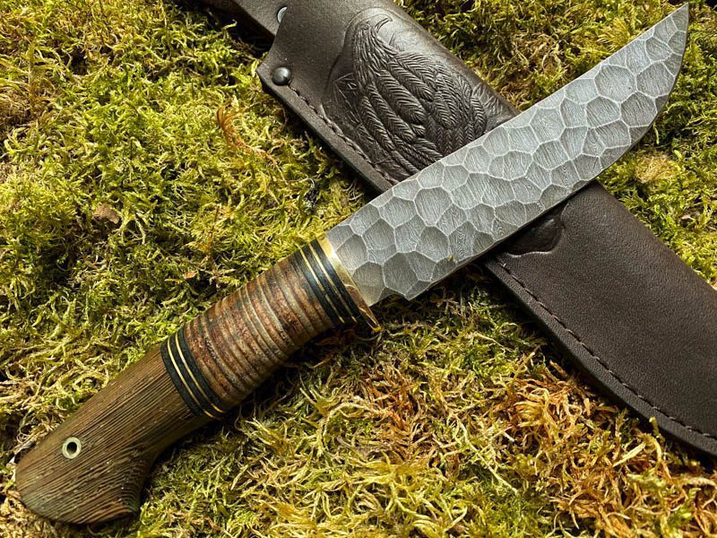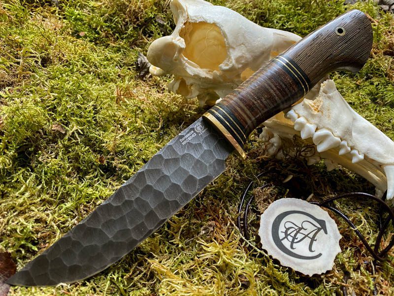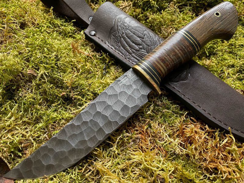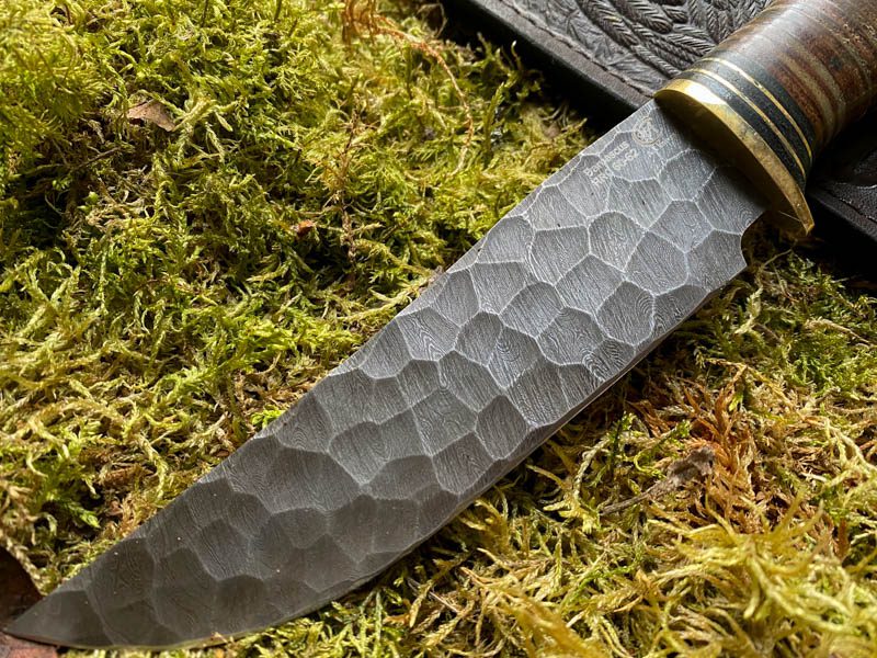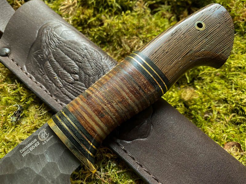 Teräs: Käsin taottu Damascus-teräksestä valmistettu metsästysveitsi, (HVG, U10, ShH15), 800 kerrosta, koristeelliset taontamerkinnät