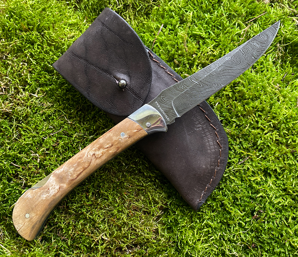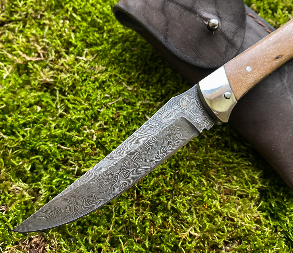 Naža tips: medības, āra Iepakojums: nazis, ādas apvalks wpml_nbsp > Ar rokām kalts Damaskas tērauda asmens izveidots ar dažādas cietības un viskozitātes tēraudu paketi, kas salokās plāksnē noteiktā secībā. Pēc tam šī plāksne tiek atkārtoti daudz reižu kalta un locīta, kalta un vērpta, pateicoties kam veidojas ļoti daudz kārtas (slāņi) tēraudā un vienreizējs zīmējums uz asmens. Šis ļoti grūtais tehnoloģiskais process tiek veikts manuāli ar rokām. Naži no Damaskas tērauda asmens izceļas ar pastiprinātu izturību, augstu cietību, tiem ir izcilas griešanas īpašības un ir vizuāli ļoti skaisti, un ilgi būs asi. AA knives damaskas tēraudā ir vairāk kā 800 slāņu (kārtu). Iepakojums Damaskas tērauda asmens ShH15 + HVG + U10 A, termiskā izteiksme 860 ° C Damaskas asmens nažu priekšrocības: Paaugstināta izturība Augsta cietība Lieliskas griešanas īpašības Skaists dizains Ilgstošs asums Asmens cietība 60-62 HRC. Ar rokām darināts nazis